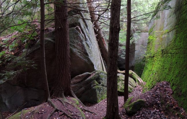 216-acre rugged plateau with boulders, streams, steep valleys, and some old-growth forest with trees up to four feet in diameter.