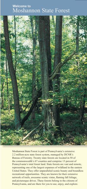 Moshannon State Forest is more than 190,000 acres in Elk, Cameron, and three other counties. Named “Moss-hanne” or “moose stream” from Native-American descriptions of the waterways that runs through it.