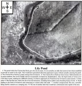 This history is the ninth in a series of articles drawn from the writings of John Imhof in his book Elk County: A Journey through Time published in 2003 describing the ghost towns that once existed along the Clarion River from Ridgway to Hallton and adjacent to Ridgway. Mr. Imhof’s book is very popular and the first printing was sold out but is available again through Amazon.com. Lily Pond – 1840’s to 1904, perhaps the least documented site along the Clarion corridor is the small settlement of Lily Pond. To call this site a town could be considered a misnomer, since it was most likely more of a logging and rafting camp that was used only when work was available. What little is known about Lily Pond comes primarily from this writer’s association with a resident of Portland Mills, Mr. Harry Fulmer. Harry grew up in the Lake City area on the plateau above the Clarion River and Lily Pond. His father, Aaron Fulmer, was a well-known lumberman and raft pilot and is believed to have worked at Lily Pond from time-to-time. This conclusion was drawn from Harry’s memories and from a discovery made many years ago by Ron Cleaver, then also a resident of Portland Mills. Ron, while exploring in the Lily Pond area located a large metal log stamp with the initials A. F., or Aaron Fulmer. Harry recalled his relatives speaking of the area, and physical evidence served to confirm the recollections. Other sources of information on the site come from accounts, albeit brief, in the classic book “True Tales of the Clarion River.” One account, by the aforementioned Mr. Oliver Meddock, states that “Aaron Fulmer and other parties were located at Lake City.” This again confirms Harry’s recollections. The account comes from a gentleman named L. G. Reynolds who had spent most of