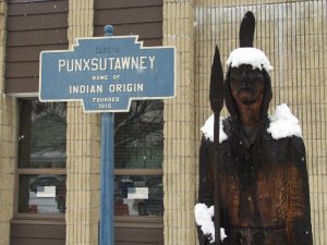 The town of Punxsutawney was originally settled and inhabited by the Lenni-Lanape Indians (“the Original People”) and the town’s name is derived from its traditional name Ponsutenink, meaning “Town of the Ponkis” (Ponki meaning sand fly). Shawnee wigwam villages once occupied this site on the Mahoning Creek. The first settlement that included non-indigenous people was in 1772, when Reverend John Ettwein, a Moravian Church missionary, arrived with a band of 241 Christianized Delaware Indians. Swarms of gnats plagued early settlers and their livestock for years and are blamed for Ettwein’s failure to establish a permanent settlement there. The clouds of biting gnats eventually drove the Indians away. The Indians called the insects ponkies (living dust and ashes) and called their village Ponkis Utenink (land of the ponkies), from which the present name Punxsutawney evolved. The area was originally settled by the Lenape (Delaware Native Americans), and “Punxsutawney” derives from a Native name in Unami (a Lenape language): Punkwsutènay, which translates to “town of the sandflies ” or “town of the mosquitoes” (punkwës- ‘mosquito’ + -utènay ‘town’).